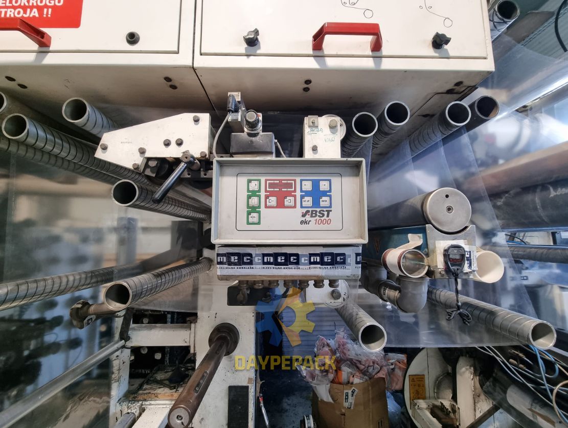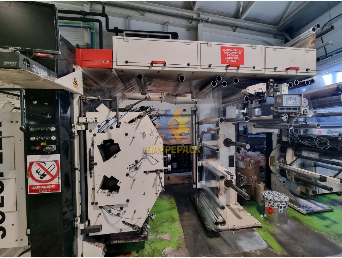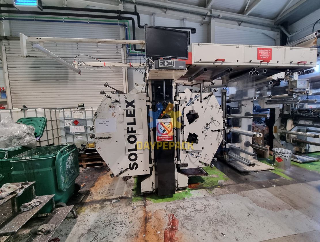 La impresora flexográfica marca W&H, modelo SOLOFLEX del año 1996, ofrece un ancho de 650 mm y un cambio rápido de mangas Anilox y portaclichés. Equipada con secado eléctrico, repetición mínima/máxima de 250/520 mm, tratador de corona, alienador BST y cámara de vídeo BST. Cuenta con anilox cerámicos y un módulo de engranaje de 5 mm helicoidal, logrando una velocidad de impresión de 150 mts/min dependiendo del diseño y tipo de tinta. Funciona con un voltaje de 380 V/50 Hz y está disponible de manera inmediata. Sus dimensiones son 6.5 m de largo x 3 m de ancho x 3.2 m de alto, habiendo cambiado la corona del tambor en 2016.